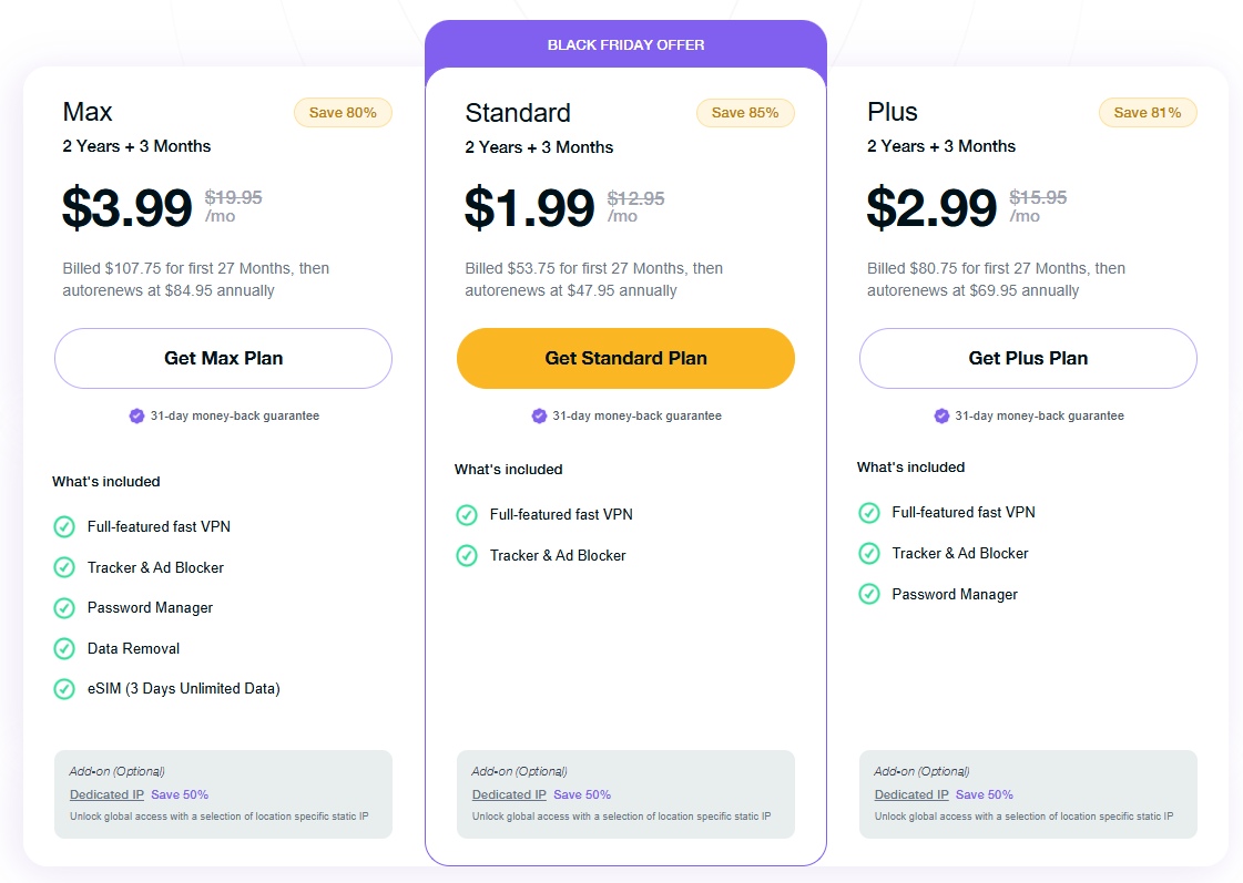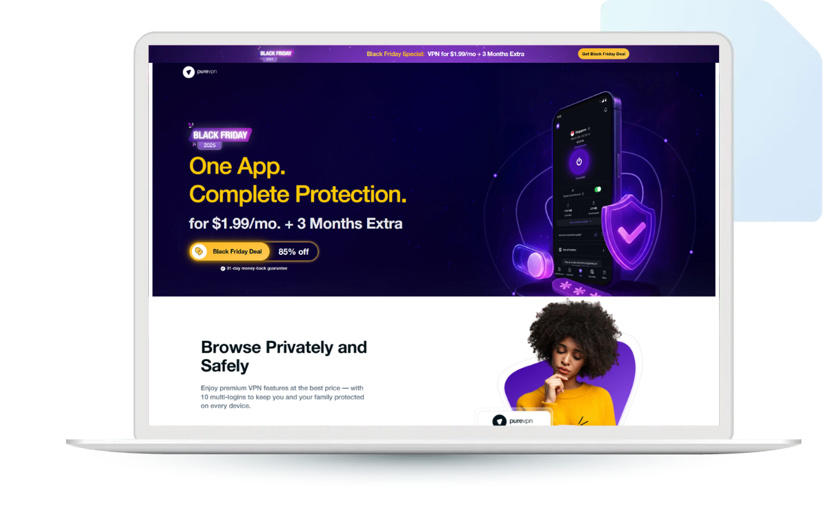 Editor-tracked Black Friday pricing shows PureVPN’s 1-year plan from $1.99 per month.